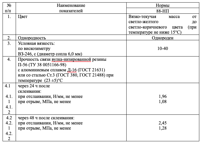 Клей 88-НП (Для общепромышленных целей), Клей 88-НП-1 (Для авиационной промышленности) предназначен для приклейки холодным способом резин (в том числе и губчатых) на основе НК, СКН, СКБ, СКС, СКМС – хлоропреновых каучуков к металлам (в том числе и окрашенным), к стеклу и другим материалам, а также резины к резине, работающих в среде воздуха в любых климатических условиях при температуре от минус 50 до плюс 70°С.