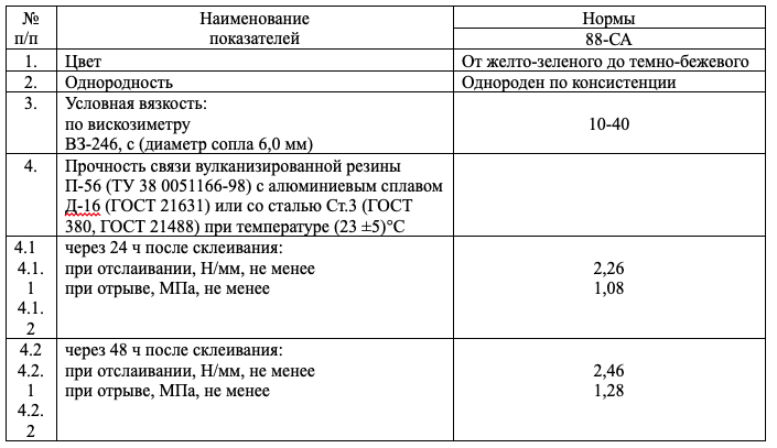 Клей 88-СА для приклейки холодным способом резин на основе каучуков общего назначения к металлам, стеклу и другим поверхностям, а также для склеивания резины с резиной. Изделия, склеенные клеем 88-СА (с герметизацией торцов и кромок) могут эксплуатироваться в среде воздуха, морской и пресной воды в интервале температур от минус 50 до плюс 60°С. Клей не вызывает коррозии стали и алюминиевых сплавов.